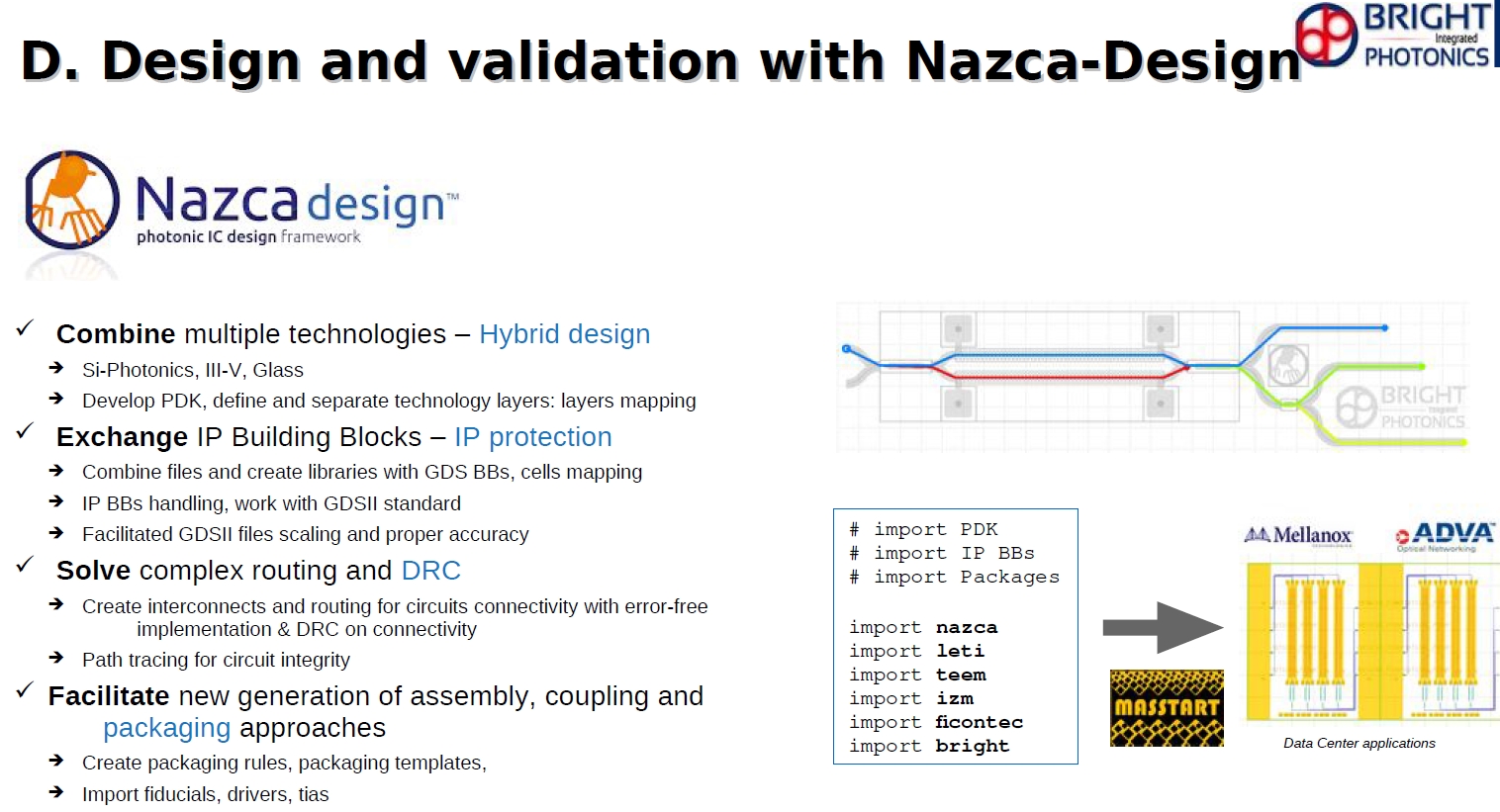 * PDKs have been developed by Bright Photonics, which include combination of multiple technologies (Si-Photonics, III-V, glass, assembly and packaging).