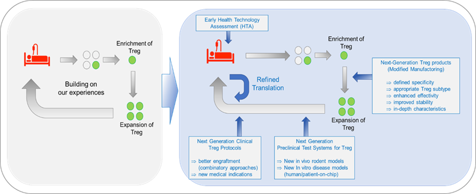 In contrast to conventional drugs, Treg can reshape the immune balance, leading to lasting therapeutic effects even after just one treatment. So far, mainly autologous (patient-derived) 1st-generation Treg products have been used, which have achieved very promising results. In order to expand the possible medical indications for Treg therapy, to further increase safety and efficiency and, in the long term, to reduce the costs of therapy by developing off-the-shelf allogeneic Treg products, next-generation Treg therapy approaches should be developed.