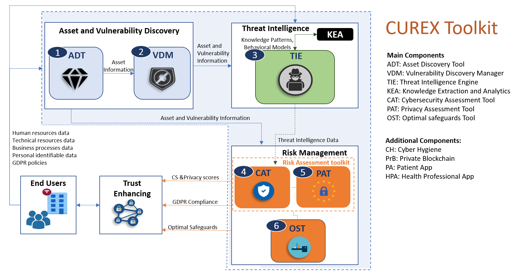 CUREX addresses the emerging needs of the domain by proposing a risk-based cybersecurity framework that takes into consideration the hospital workflows, as well as the ubiquity of medical devices in care settings. CUREX aims at protecting the health data handled by hospitals from the risks that are propagated all the way from the security gaps in their IT infrastructure by implementing a risk-based approach, performing continuous cybersecurity and privacy risk assessments based on the reported assets, vulnerabilities, and real-time detection of imminent threats. CUREX also offers optimal recommendations for cyber risk mitigations in the form of a decision support tool. Overall, the CUREX Platform encompasses a suite of tools establishing trust between healthcare organisations to accommodate the necessity of exchanging data in a fully GDPR-compliant manner. By capitalising on existing distributed ledger and health technological artifacts, CUREX ensures the accountability and auditability of all transactions between hospitals and care centres. Finally, taking into account the human factor, it improves the cyber hygiene culture among personnel through identifying employee group-specific gaps and needs with regard to raising cybersecurity and data privacy awareness.