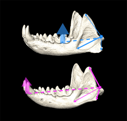 - American mink have relatively larger masticatory and neck muscles than European mink, but mandible shape adjusts muscle lever arms and mechanical advantage so that American mink are built for strong anterior bites (and thus killing small mammals) and European for fast mandible closure and strong cheek bites (ideal for feeding on aquatic prey) (Fig. 2)