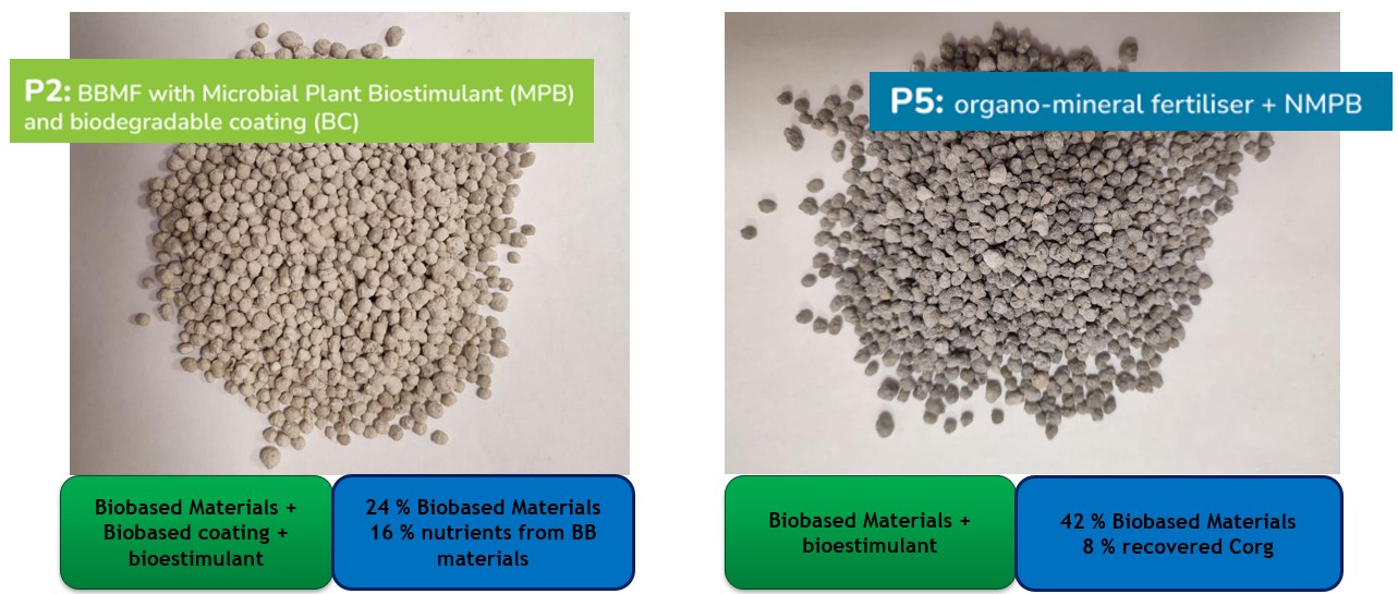 Two first-of-its-kind demo plants were built: one for nutrient recovery using novel acid leaching technology to extract insoluble phosphates from biowaste; the other for applying biobased coatings such as biostimulants (MPB or NMPB) and biodegradable biopolymers to enhance soil nutrients and fertilizer performance. These two innovative processes were introduced as part of B-Ferst in order to make the manufacturing process more sustainable and have an improved and more sustainable final product thanks to the reuse of biowaste.