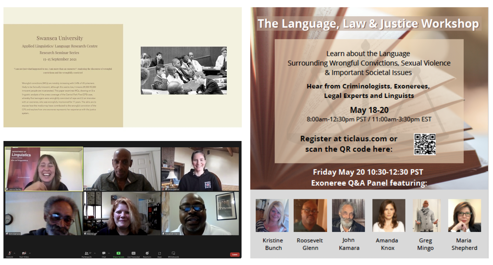 A final output from the TICLAUS Project was a hybrid workshop held at SFU, organised by the ER and her research team in May 2022. The workshop was entitled “The Language, Law & Justice Workshop (LLJ)” and scholars from Linguistics and Criminology (based at universities across the globe) were in attendance, together with exonerees, the founder of Innocence Canada and the Director for Innocence Canada Board of directors. In coming together, all participants shared their experiences or details of their research; perhaps more importantly, future work and collaborations were also proposed, which was a key aim of the workshop for the ER. The LLJ workshop also provided an opportunity to draw awareness to sexual assault and WCs within and beyond the gates of academia and, given the range of attendees from over 40 countries worldwide, including students, academic staff across disciplines, the general public and those working for the Innocence Network, the ER felt this was successful. Moreover, this scientific meeting opened up opportunities for the ER, such as: