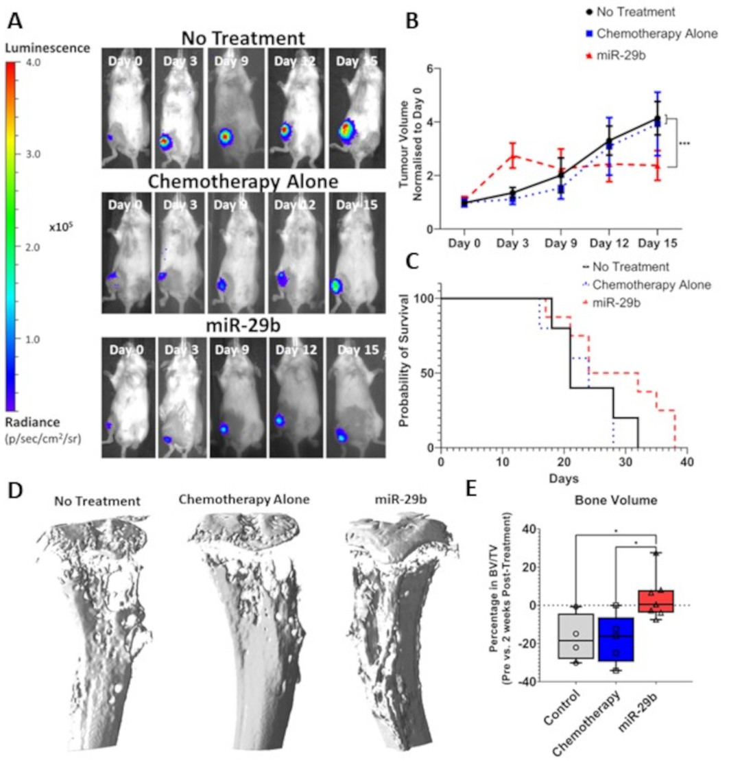 We developed a formulation of miR-29b:nanoparticles that were delivered via a novel hyaluronic-based hydrogel to enable local and sustained release of the therapy, and to study the potential of attenuating tumour growth whilst normalising bone homeostasis. We found that when miR-29b alone, compared to chemotherapy alone, our therapy provided a significant decrease in tumour burden, increase in mouse survival, and a significant decrease in osteolysis thereby normalising the dysregulation of bone lysis activity caused by the tumour (Figure 2). This work is currently under review in Advanced Materials.