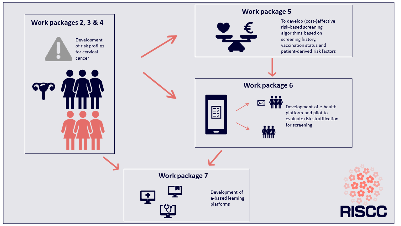 Most screening programs report a high proportion of unnecessary colposcopy referrals. Also, the number of screening invitations varies between European countries from 7 to >40, but is not clearly associated with the country-specific CC incidence. This suggests considerable overuse in some regions. To eliminate CC as a public health problem, the effectiveness and efficiency of screening programs and resources should be directed to those most at risk. Current protocols can be dramatically improved. RISCC aims to develop and evaluate the first risk-based screening program for CC, provide open-source implementation tools and contribute to the elimination of CC in Europe.