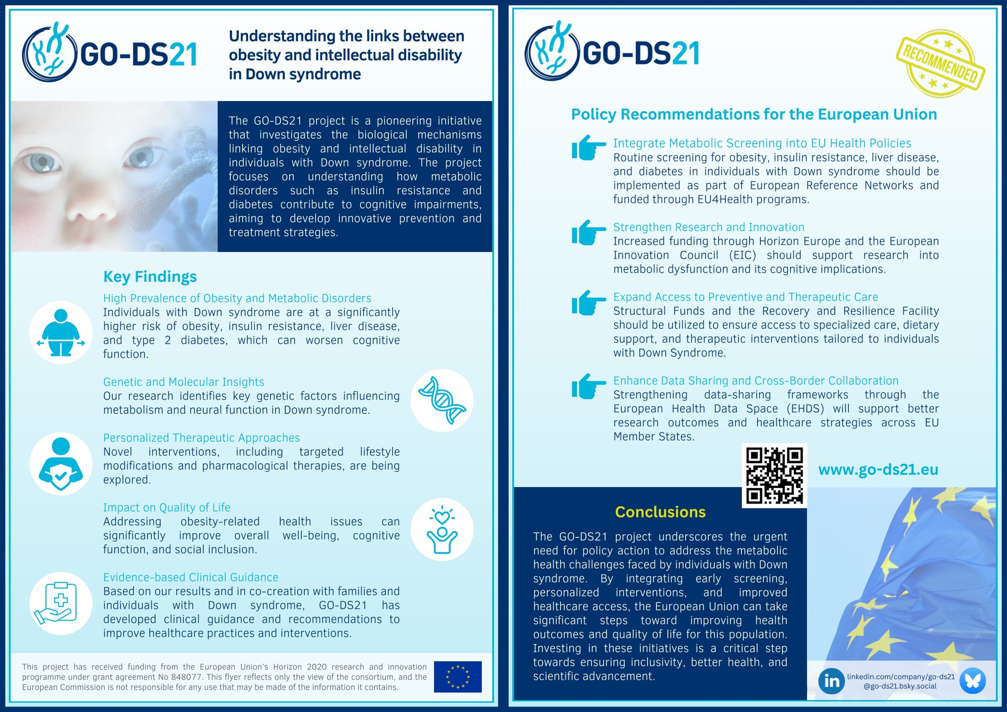A major focus of GO-DS21 was to communicate findings to people with DS, their families, clinicians, and the public. The project website received over 77,000 visits. Educational videos, brochures, and a fairytale book were created to explain the science in accessible ways. A mobile app, FoodFall, was launched to promote healthy eating. Clinical guidelines on managing obesity in DS were developed and shared with healthcare providers and patient associations.