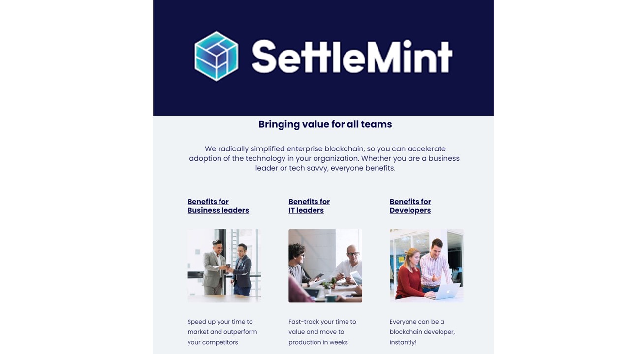 At SettleMint, we bridge the gap between enterprise and blockchain technology by providing a middleware solution – MINT - that makes it easy for companies to plug-in on the blockchain technology in a few weeks’ time.