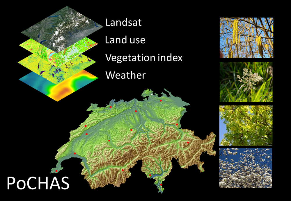 The EPOCHAL project will develop spatiotemporal exposure models of pollen for the years 2003-2022 based on a network of 14 pollen measurements stations in Switzerland, for which species distribution data, land-use and elevation maps, and satellite-observed greenness and weather data forms the basis.