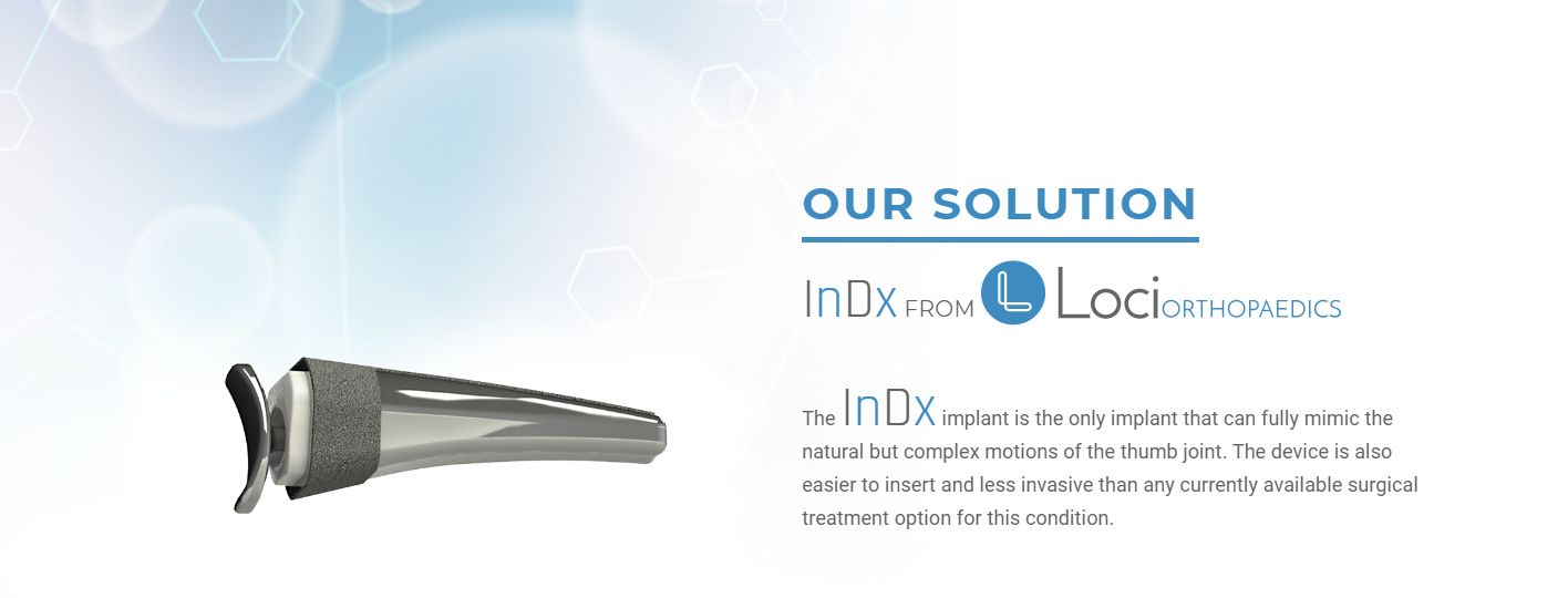 As thumb base joint arthritis has a significant psychological impact on patients, the modification and amelioration of symptoms will have a positive impact on a patient’s ability to live and function independently. The current treatment options for this condition result in a significant loss of hand function as well as a recovery time of up to six months. The InDx implant has the potential to fully restore hand function with a recovery time estimated at eight weeks and become the gold standard technology for the treatment of thumb base joint arthritis. At this time, when it is more important than ever for people to be able to live independently and at times in isolation from others, the InDx Implant is a product that will relieve pain, increase hand function, and support patient independence.