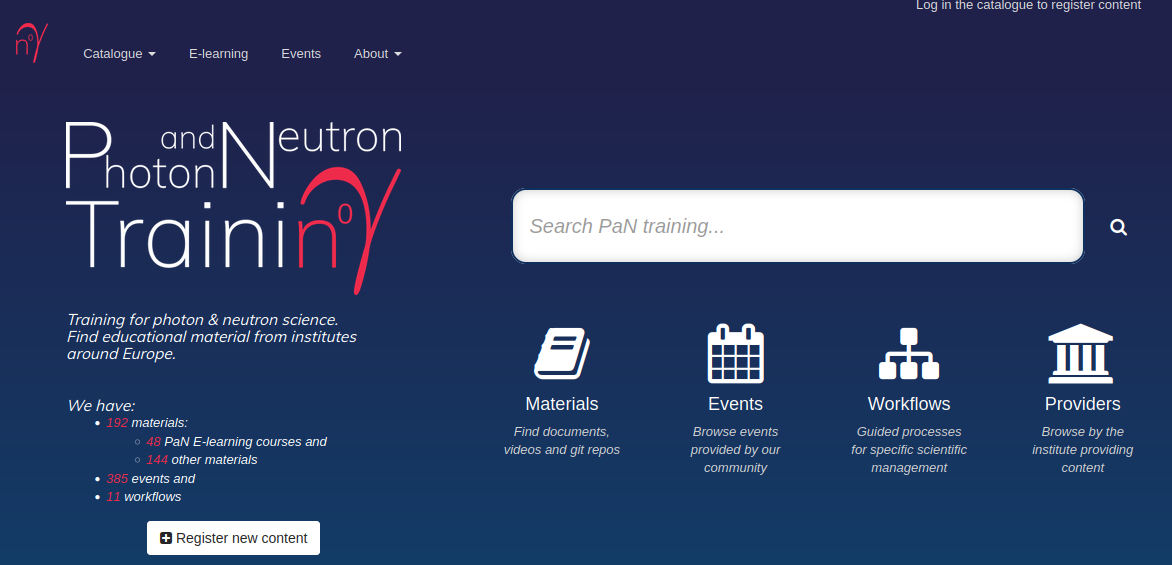 To aid in training, ExPaNDS developed a training catalogue, pan-training.eu which is a one-stop-shop for trainers and trainees to discover available online materials, workflows, and events. This training catalogue is also the gateway to the PaN e-learning platform.