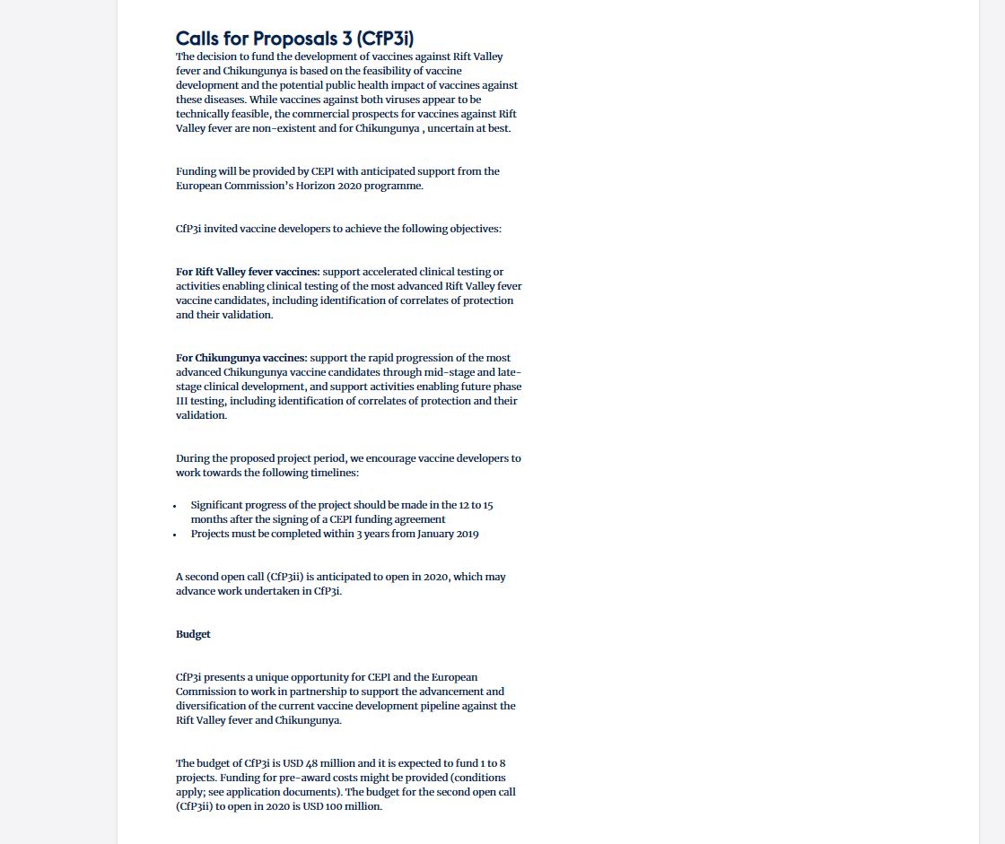 Please see cepi.net for further details about the progress of the most recent call relating to Chikungunya and Rift Valley Fever (termed “CfP3i).