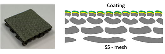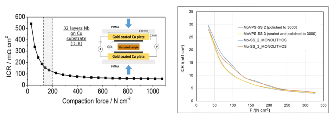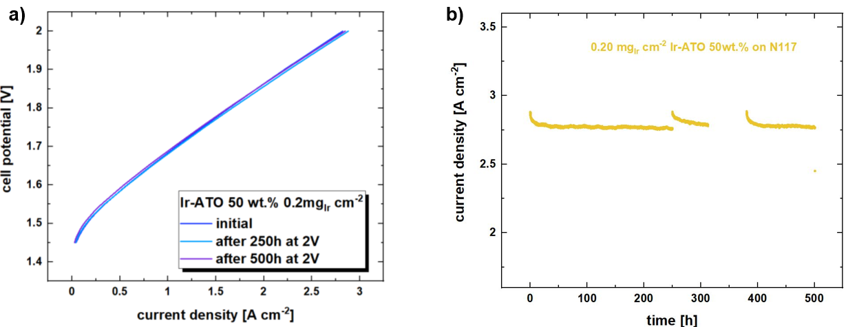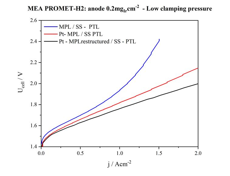 The need for de-carbonization of our society is a pressing issue raising the attention at social and political levels. The production of high value chemicals and fuels such as methanol requires hydrogen derived at the moment from hydrocarbons and resulting in large emissions of CO2. Green Hydrogen produced by water electrolysis coupled to renewable sources could be the ultimate solution to this problem. Proton exchange membrane water electrolysis (PEMWE) is the most suitable technology for this process due to its compactness and flexibility. However, the dependence on precious metal catalysts and expensive components manufactured in titanium poses a serious threat for the scale up and market penetration of this technology. PROMET-H2 project aims to develop a pressurized PEMWE with the lowest capital cost ever achieved. The main objective of PROMET-H2 project is to decrease the capital cost of the PEMWE from 1000-1500 €/kW to 500-700 €/kW without compromising its performance and durability, and replacing noble metals with others that are more benign from an environmental and economic point of view. The main ambition in PROMET-H2 is to place PEMWE as the technology of choice for production of H2 for storing renewable energy and being a competitive alternative for large scale storage, by maintaining a balance between economic/costs and environmental aspects. PROMET-H2 overall ambition will be tackled by i) developing advanced materials, including CRM-free catalysts, ii) coatings for stainless steel PTL and BPP, iii) thin membranes to reduce PEMWE cost without affecting the current KPIs performance and durability and iv) by using new stack designs to obtain more efficient PEMWE being able to reduce the system and process costs. Conclusions. PROMET-H2 has developed a PEMWE stack with a reduction in the capital costs and CRM, the significantly reduced use of critical raw materials will mitigate the limitation of material availability for the large-scale deployment of water electrolysis. CCMs with low Ir loading based on Ir on ATO have been developed achieving project target 2 Acm-² at 1.9 V with 0.2 mgIrcm-² with 1000h stable operation. Stainless steel as base material for manufacturing PTL has successfully developed. The reduction in use of CRMs is further strengthened by developing versatile and environmentally friendly recycling procedures using hydrometallurgical process, recovery rates (100% Pt, 60% Ir). In addition to the materials development, PROMET-H2 has developed a tool for testing locally the homogeneity in the current density distributions and temperatures at stack level.