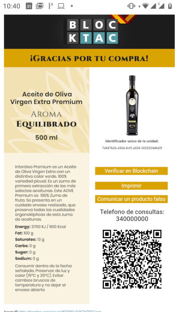 The atomization of production, and the effort of the industry in production and quality result in a large offer of olive oil and a high-quality product. However, the poor preparation of producers in promotion and marketing results in the product ending up being sold below its cost. Blockchain Single-use digital seals are an effective way to fight counterfeiting and fraud. It also generates extraordinary additional functionalities in marketing. Although no major issues have been detected, some points have been addressed: a faster and easier deployment; lower costs; and use of NFC.