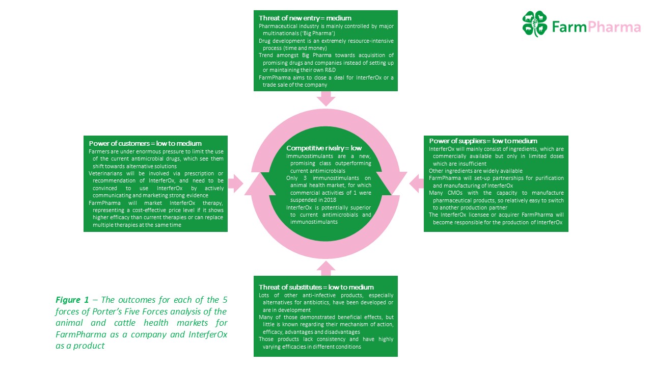 The feasibility study has been performed to provide insights into the cattle health markets, to develop the commercialization and IP strategies as well as to expand value chain for FarmPharma. The consolidated and investor-ready business plan was compiled based on this study. The study revealed that FarmPharma will be targeting the cattle antimicrobials market segment of animal health market, which is currently worth of €1.7 billion and expected to further grow in the coming years. This growth is driven by a rising demand for animal protein products, a growing incidence of zoonotic diseases, regulations to prevent spread of animal diseases, and increasing R&D in animal health. On the other hand, further growth of the market is hampered by a lack of new antibiotics, rising antimicrobial resistance, expensive animal healthcare, and increasing consumer awareness. However, as a new and effective antimicrobial therapy, based on natural interferons and thus not causing any resistance, InterferOx is providing a solution to the first two restraining factors, meaning that these market-restraining factors are actually favourable for FarmPharma. The structure and conditions of the cattle antimicrobials market are also very favourable for FarmPharma as a company and InterferOx as a product (Fig.1). The competition within the industry is minimal, the bargaining power of customers and suppliers is restricted, the threat of substitute products is limited, and the threat of new entrants is moderate. Evaluation of freedom to operate reveals that InterferOx will be patentable. To launch InterferOx on the market all by themselves is very difficult for FarmPharma, instead FarmPharma follows the most successful approach by joining forces with a big pharma company, either via a licensing or co-development deal for InterferOx or a trade sale of the company. It is key to generate data on the efficacy, safety and cost-effectiveness of InterferOx against selected pathogens in preclinical and clinical trials. The target pathogens have been chosen based on the indication where InterferOx can have the most impact. Thereafter an interest for a licensing deal or acquisition from many animal health companies can be expected. The highest value and return on investment being expected after successful registration of InterferOx. FarmPharma has set up a collaboration with one of the leading European animal health regulatory agencies to advise on the best consecutive steps for approval, assess the optimal regulatory strategy for bringing InterferOx to the market and implement this as early on in the development process as possible. FarmPharma has established an international consortium with complementary expertise in immunology, drug development and agriculture consisting of three SMEs and two academic partners which together will develop, upscale and clinically validate our unique veterinary product InterferOx. FarmPharma represented this business idea to investors and local life science community in Uppsala innovation center, Connect Sverige (Uppsala investors network) and Invest in Green 2019 Svenska Solelmässan.