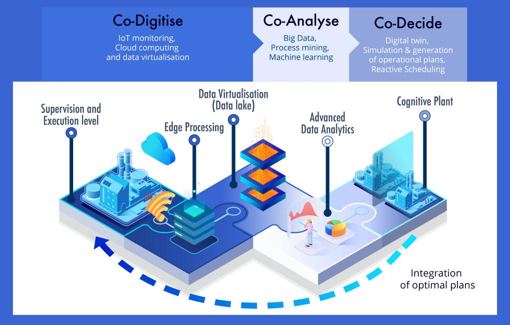 3. Optimisation methods to distributed targeted process monitoring: The huge amount of data generated at by the IoT connected assets a strong edge node will be set up, that will be capable of processing signal transformation functions and moving the results to the cloud as an aggregated output. Advanced distributed logical controls and a comprehensive suite of processors will be developed for a fast response over recurring problems will be directly done on site and will be transferred to the Cloud platform (Data virtualisation layer). In real time, the Co-Digitise platform will offer enough sampling frequency for a detailed information extraction and solutions.