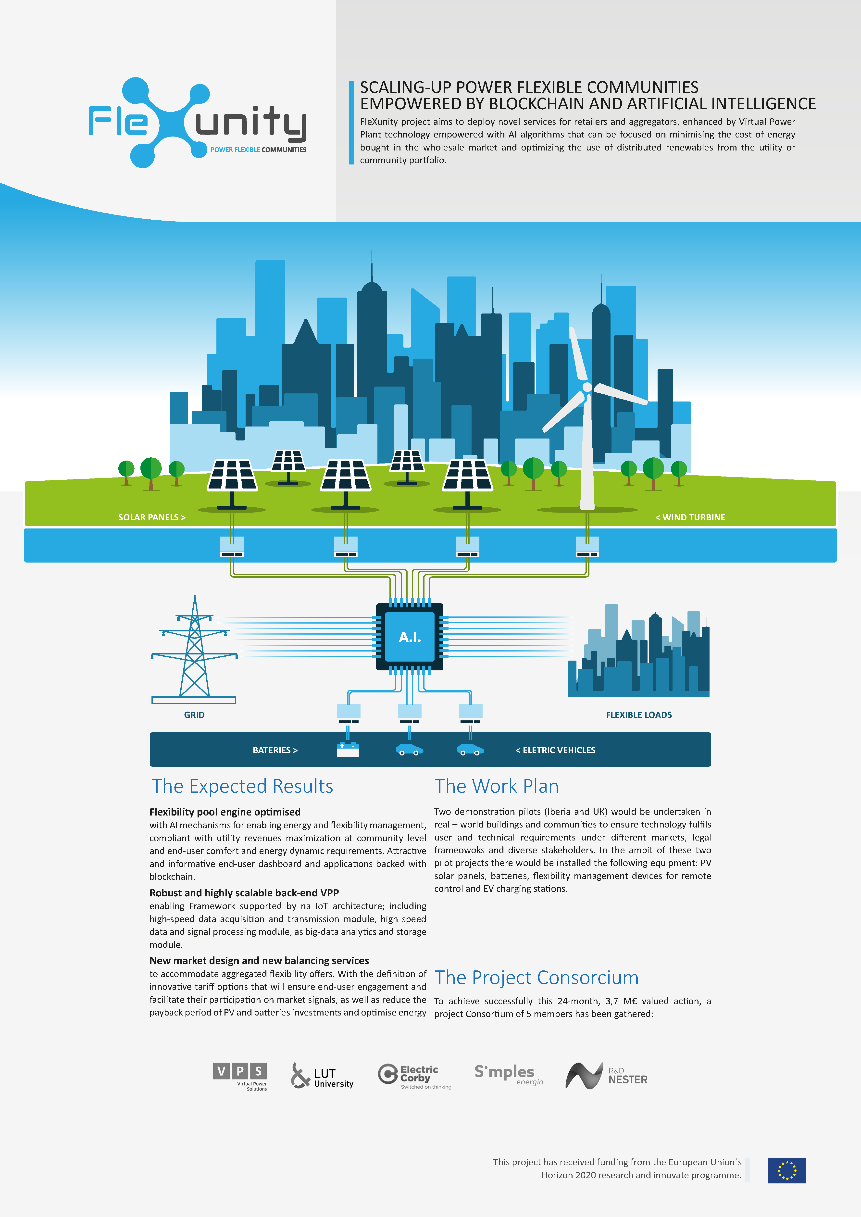 The main objective of the FleXunity project was to develop and validate a Virtual Power Plant (VPP) digital tool based on advanced Artificial Intelligence, remote automatization and blockchain to optimize community energy flexibility, match consumer’s energy needs, ensure further development of RES, optimize distributed energy resources, and contribute to the current energy security and climate change challenges, while enhancing retailers and aggregators competitive advantage.