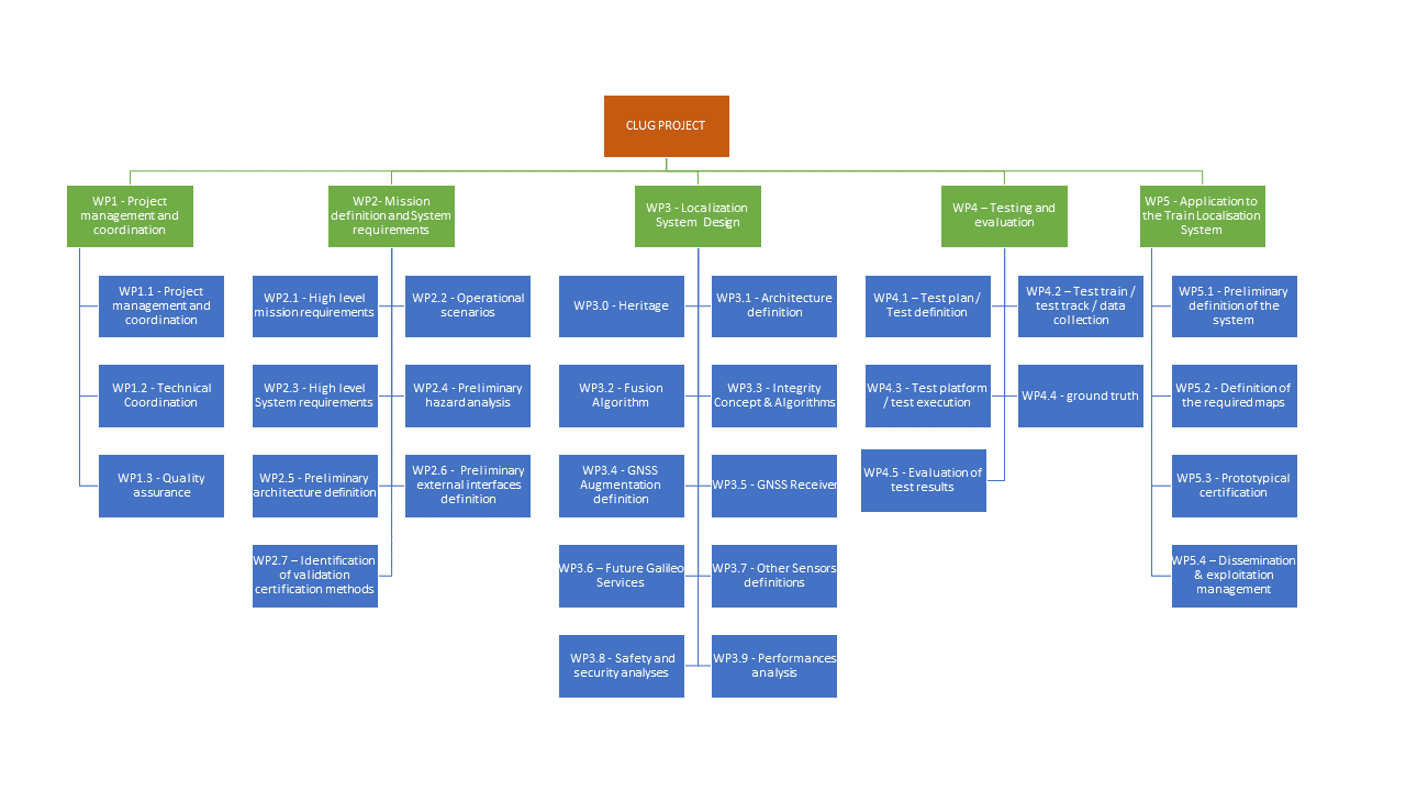 Bringing together railway companies (SNCF, DB Netz and SBB), railway signalling industries (CAF and Siemens), navigation specialists (Airbus Defense & Space, Naventik, FDC), a research institute (ENAC) and a certification expert (NaveCert), the CLUG Project will improve localisation performance and enable multiple new applications. Ultimately, this project pushes for the development of a key enabling localisation technology strategic for the future-proof set-up of train digitalisation and automation to respond to the increased mobility needs of all European citizen and goods by leveraging the train, a green safe and efficient means of transport.