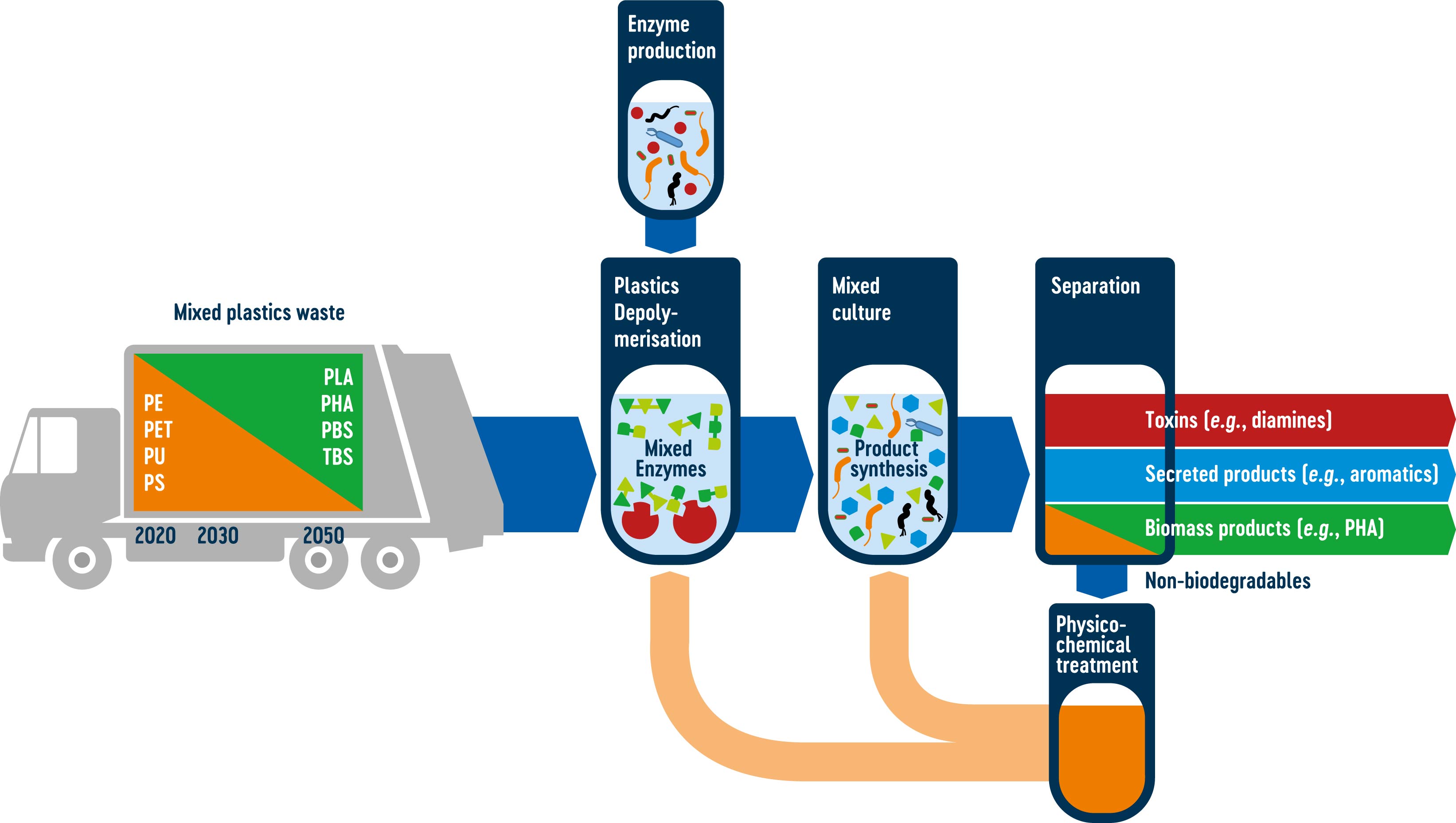 Despite their recalcitrance, certain microbes and enzymes can degrade plastics. We have identified and characterized PET, PLA, and PU degrading enzymes and highly engineered them for enhanced activity, stability, and efficiency. Enzyme applications during plastic waste depolymerization have been optimized alongside large-scale enzyme production. These enzymes have also been expressed in mixed cultures within a consolidated bioprocess that includes upcycling.
