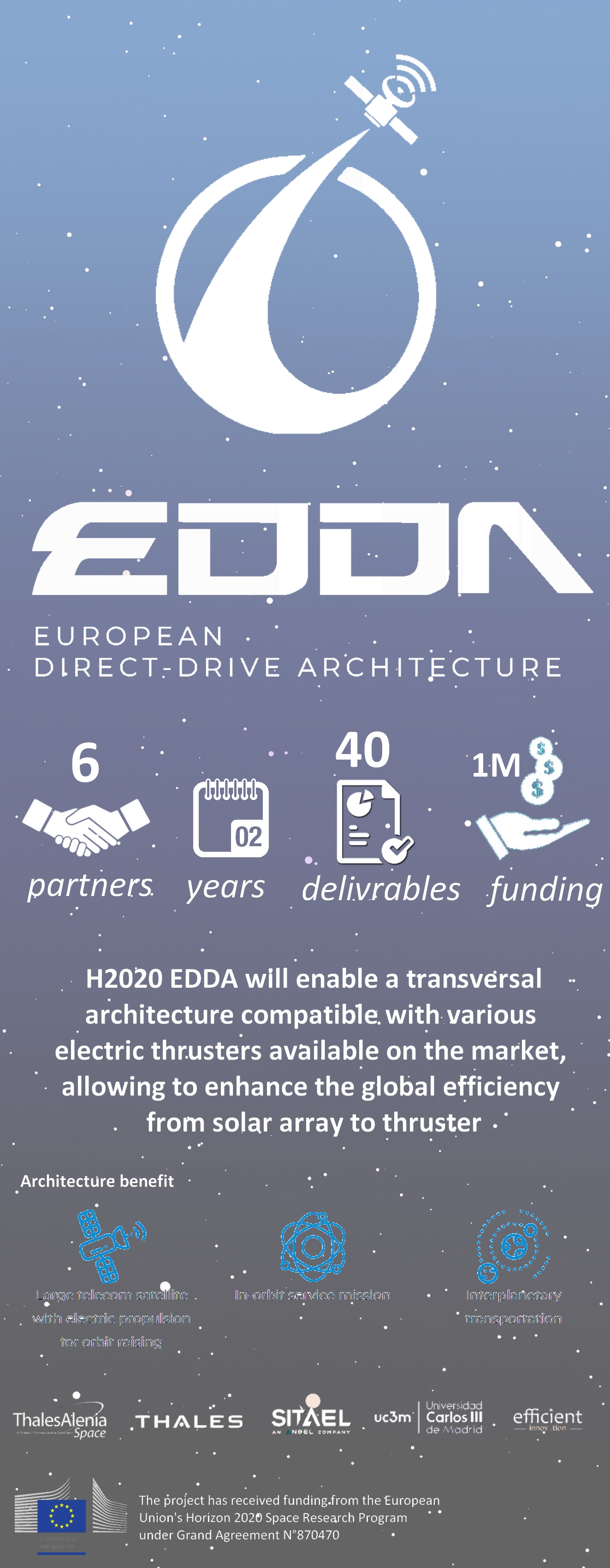 These thruster developments provide a fertile ground for EDDA (European Direct Drive Architecture) which aims to demonstrate the feasibility to provide power from photovoltaic panels directly to several thrusters at the same time and at higher voltage levels than today. Normally, electronic components called power converters are needed to deliver the right voltage and current to electric thrusters. Yet, these power converters are heavy, result in thermal losses as power conversion is not 100% efficient and highly increase the costs associated with spacecraft launches (sending one kg to space costs 15-30 k€). Direct drive is a concept connecting the power source directly (without conversion) to the user to remove these limitations associated with power electronics. Used in space environment, this disruptive concept is expected to enhance propulsion capabilities either for staying in orbit around Earth (satellites) or in the frame of space exploration missions (to the Moon or to other planets within the inner Solar system namely Mercury, Venus, Mars or Asteroids).