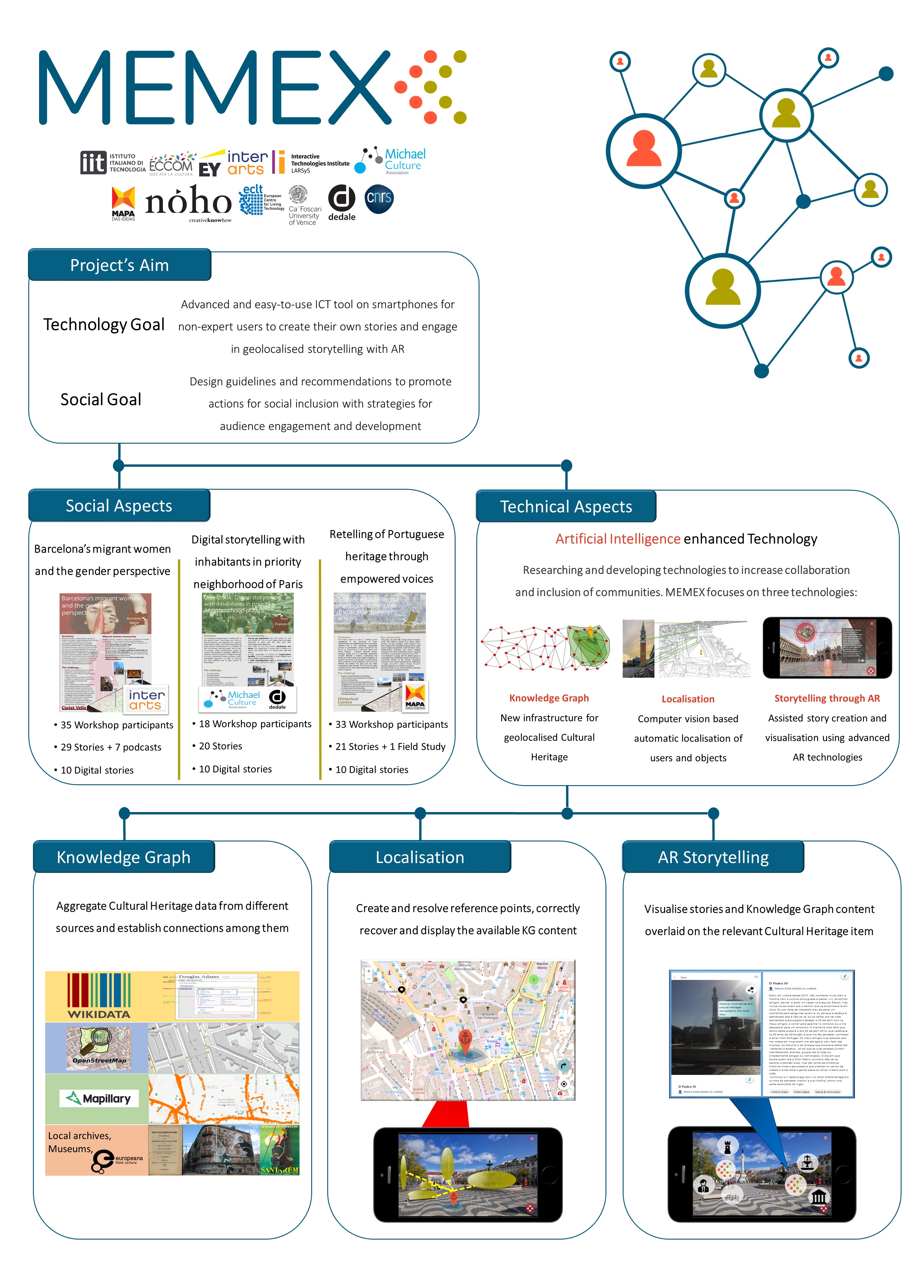 The MEMEX project encouraged cohesion through collaborative, heritage-related tools that could enable inclusive access to tangible and intangible CH and, at the same time, facilitate interactions with communities at risk of social exclusion by providing an opportunity both to share their own unique stories with the community and with the larger public, and to experience those of others. Through specific methodologies geared towards reinterpreting CH, MEMEX empowered communities to weld their fragmented experiences and memories into geolocalised storylines and personalised digital content, acknowledge the diversity of voices in society, and to exercise their rights and actively participate in European societies. Targeted to communities who are socially fragile, MEMEX deployed three distinct pilots to analyse different expectations across the European territory: