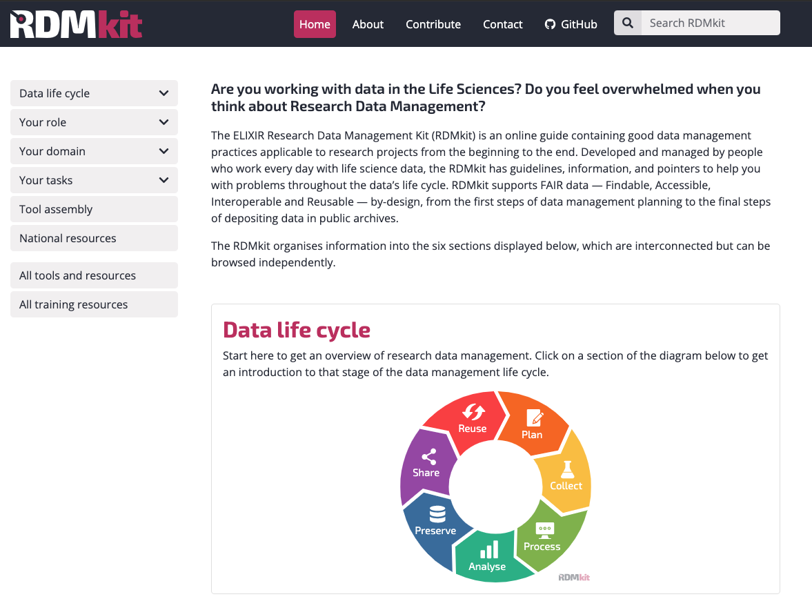The ELIXIR Research Data Management Kit (RDMkit) is an online guide containing good data management practices applicable to research projects from the beginning to the end. Developed and managed by people who work every day with life science data, the RDMkit has guidelines, information, and pointers to help you with problems throughout the data’s life cycle.