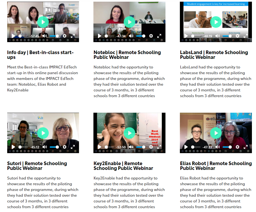 Also, the IMPACT EdTech accelerated start-ups managed to reach almost 2,000 students with ground-breaking solutions. The solutions turned were a strong asset for schools as they helped teachers secure a pedagogical continuity in their teaching, while ensuring that no child was left behind, despite the school closures and blended learning situations in most European schools.