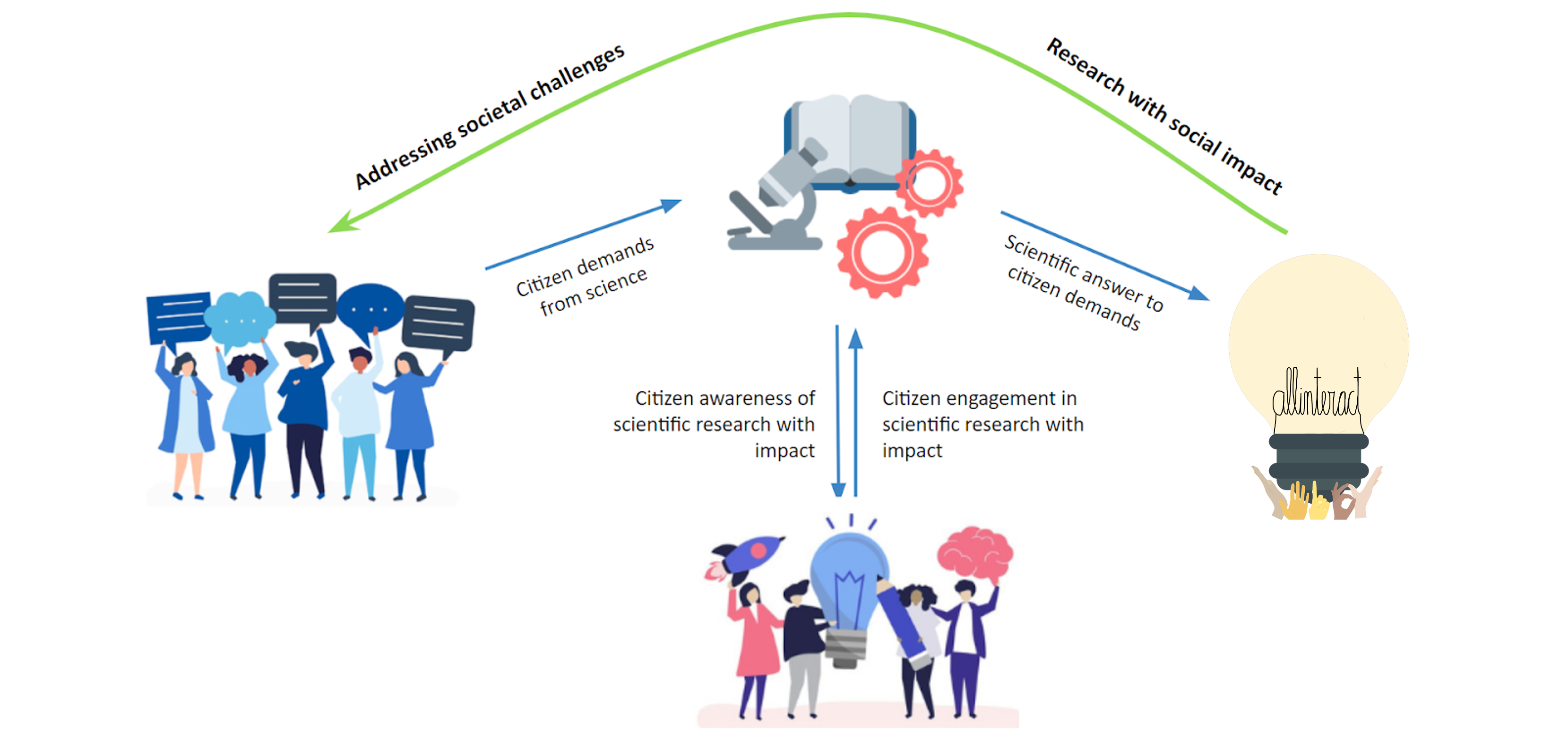 ALLINTERACT’s overall goal is to: 1) create knowledge about how to transform potential citizen participation in science into actual engagement in scientific research with social impact; and 2) discover new ways to engage societal actors in research, including youth (16-29 y-o) and vulnerable groups traditionally marginalized from science (e.g. low SES, minorities, women, LGBTI). This includes 6 specific objectives: