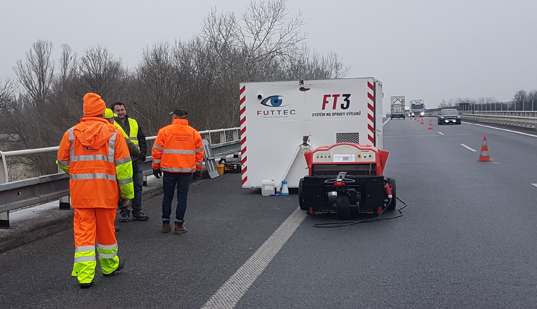 FUTTEC have developed a new technology for durable asphalt road repairs based on microwave technology. The crucial advantage of FUTTEC´s technology lies in seamless repair of potholes, while pothole surrounding is heated up by microwave machine FT3 and the pothole is filled by hot asphalt repair mixture and afterwards compacted. Asphalt heated to 145 °C has plastic properties and can be ideally joined with repair mixture without any seam, which is the cause of future failure, because it is the place, where water leak in and during winter freezes and break the asphalt layer.