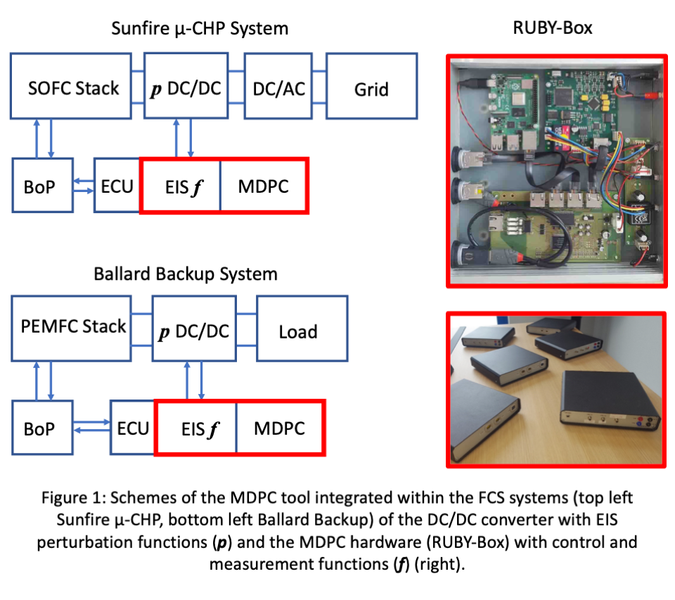 The focus of WP6 was on designing and manufacturing HW components for MDPC algorithm implementation and onboard EIS spectra acquisition. The design of the HW for EIS stimuli to be injected by a DC/DC converter was completed for both SOFC µ-CHP and PEM backup. The RUBY-Box was built incorporating MDPC, Analog Front End board, Ethernet network connection and cost-effective Raspberry Pi boards. Six new RUBY-Box prototypes are currently undergoing electrical testing in laboratory. The Figure 1 shows the schemes of both µ-CHP and Backup systems integrated with the DC/DC converter embedding the EIS perturbation functions (p) and the RUBY-Box (red boxes) featuring control and measurement functions (f).