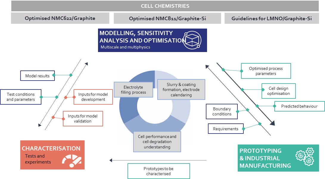 The project consortium combines competences in multiple fields of modelling and characterization of lithium-ion battery materials, electrodes and cells. As a result, the effects of the different production parameters and their interactions on the cell performance will be described and better understood, and the information provided by the models and simulation will result in an increase of the production’s overall efficiency, in a decrease of the time necessary to take an idea from its conception to the market and, consequently, in a reduction of the production process time and cost. This approach will be applied to the current G/NMC industrial cells and it will be extended to last generation 3b prototypes (high capacity and high voltage cells with a high Ni-content and a low Co-content with silicon-graphite composite anodes). Characterisation tests will also provide data for model development and validation, and for gaining understanding on manufacturing process parameters and cell ageing mechanisms.
