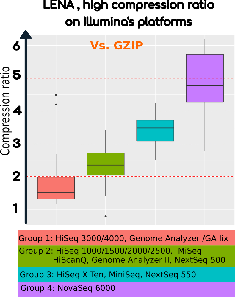 The technical study has shown excellent performance results of LENA over data generated by latest sequencing instrument. Savings over storage can go as high as 75% and voluminous file transfers can be 5 times faster. Market survey also revealed performance were in line with customers expectations and highlighted further points that needed to be addressed depending on storage strategy.