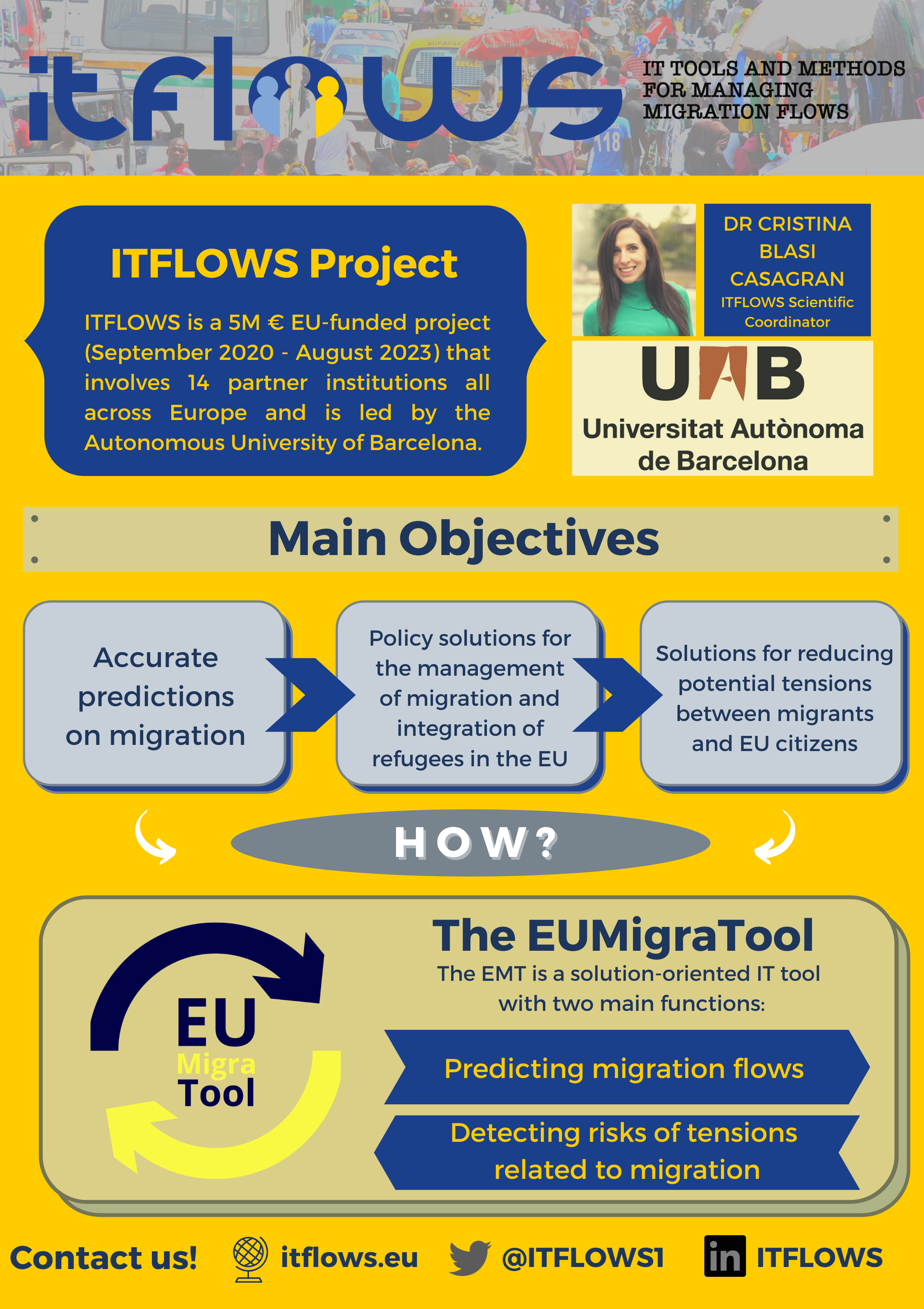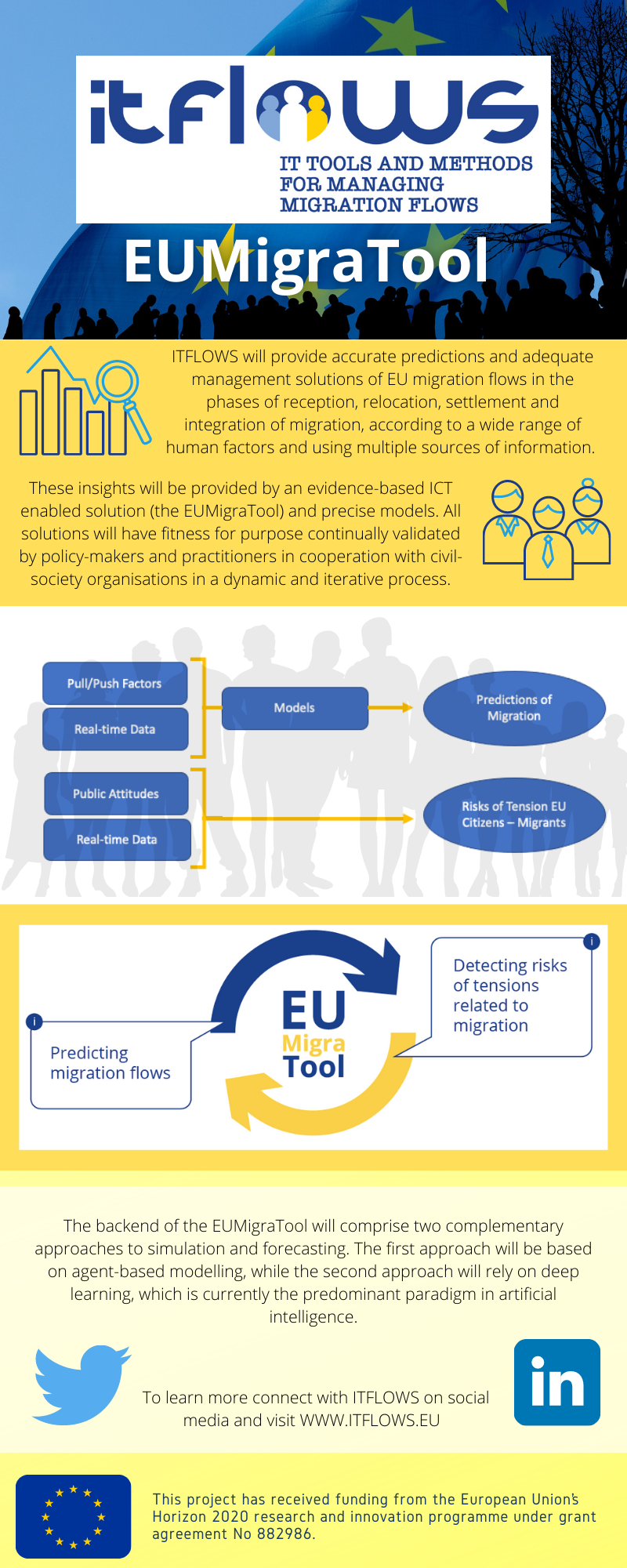 The purpose of ITFLOWS was to provide accurate predictions and adequate management solutions of migration flows in the EU in the phases of reception, relocation, settlement and integration of migration. These insights are provided by an evidence-based ICT enabled solution -the EUMigraTool (EMT)- and precise models. All solutions have been continually validated by policy makers and practitioners.