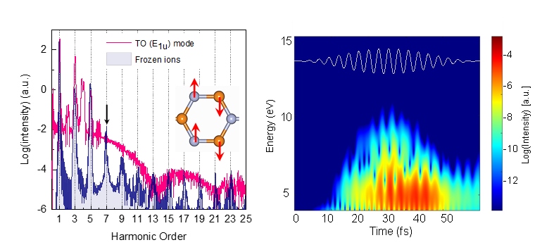 In addition, we theoretically investigated the role of collective coherent vibrations in HHG in a wide range of solids (e.g. hBN, graphite, 2H-MoS2, and diamond). We predicted that phonon-assisted high harmonic yields can be enhanced significantly compared to the phonon-free case – up to a factor of ~20 for the transverse optical phonon in bulk hBN. We also showed that the emitted harmonics strongly depend on the character of the pumped vibrational modes. Through state-of-the-art ab initio calculations, we elucidate the physical origin behind the HHG yield enhancement – phonon-assisted photoinduced carrier doping, which plays a paramount role in both intraband and interband dynamics. Our work showed a direct path for understanding phonon-mediated nonlinear optical processes in materials and provides a significant knob to engineer and control solid-state high harmonics.