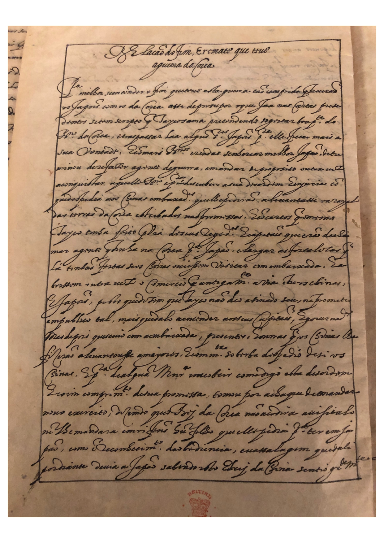 During the first part, research visits to the Biblioteca de Ajuda in Lisbon, the Royal Academy of History and the National Library in Madrid, the General Archive of the Indies in Seville, the Archivum Historicum Societatis Iesu in Rome and the British Library in London were crucial due to their primary sources in Portuguese and Spanish language on the Imjin war. Manuscripts found that played a main part in the study of this project are: