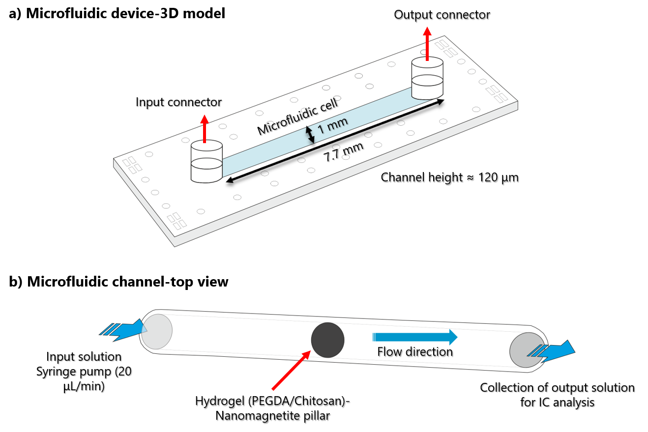 b) We performed a series of flow-through controlled experiments through cylindrical aggregates in a microfluidic set up involving cylindrical structured PEGDA/nanomagnetite aggregates to obtain Break Through Curves (BTC) of the contaminants of interest. Antimony solution made with KSb(OH)6 at various pH values is used as the input solution. We showed the efficiency of the system and a significant retention of Sb depending on the initial concentration and the material of the aggregates.