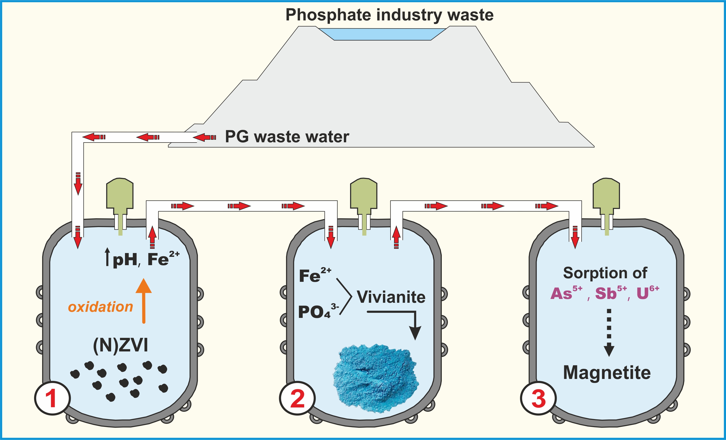 a) We performed batch sorption experiments targeting toxic, acidic, and phosphate rich waste leachates. We focused on the effect of magnetite on U reduction, and As and Sb oxyanion removal, also, addressing the problems of high acidity, and high phosphate concentration, which are the major inhibitors of the treatments proposed so far. As such, we set the basis for an industrial process to decontaminate the aforementioned effluent waters by (i) first, using ZVI to increase the pH of the water while producing Fe2+, (ii) the precipitating phosphate ions as vivianite, and (iii) finally, using magnetite derived from steel industry wastes to immobilize toxic pollutants under different pH conditions and high phosphate concentrations. This three-step process provides new insights into a new ‘green’ route for the decontamination of drinking and waste waters.