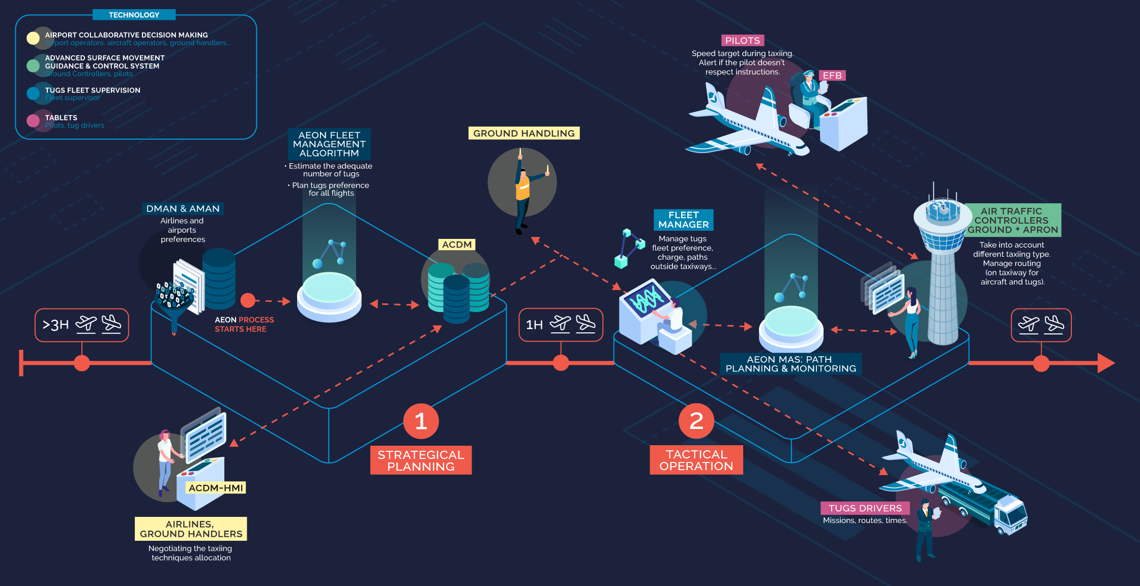 The aims of the AEON Project are to perform research supporting future implementation of green taxiing techniques and to provide a set of tools and interfaces for the different ground operators. These tools are supported by dedicated algorithms to improve the allocation of towing vehicles and path planning efficiency.