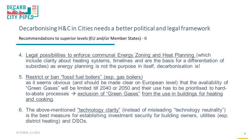 The project succeeded to support several meetings at which the gas package was discussed by Members of the European Parliament and members of the European Commission and contributed to the final design of the directive calling for increased alignment of the network development plans for natural gas, hydrogen and electricity, in particular also at the distribution grid level. Hydrogen is to be used primarily in sectors that are difficult to decarbonise. Municipal heating and cooling plans, which all cities with a population of over 45,000 must draw up in future, must also be taken into account when planning the grids. Gas distribution network operators must draw up plans for the decommissioning of networks if the implementation of municipal heating plans is expected to lead to a decline in demand for natural gas. At a press conference on the directive at the end of the trilogue, the rapporteur on the directive in the European Parliament referred to the example set by cities in the Decarb City Pipes consortium as one of the factors that inspired the call for mandatory network planning for gas distribution.