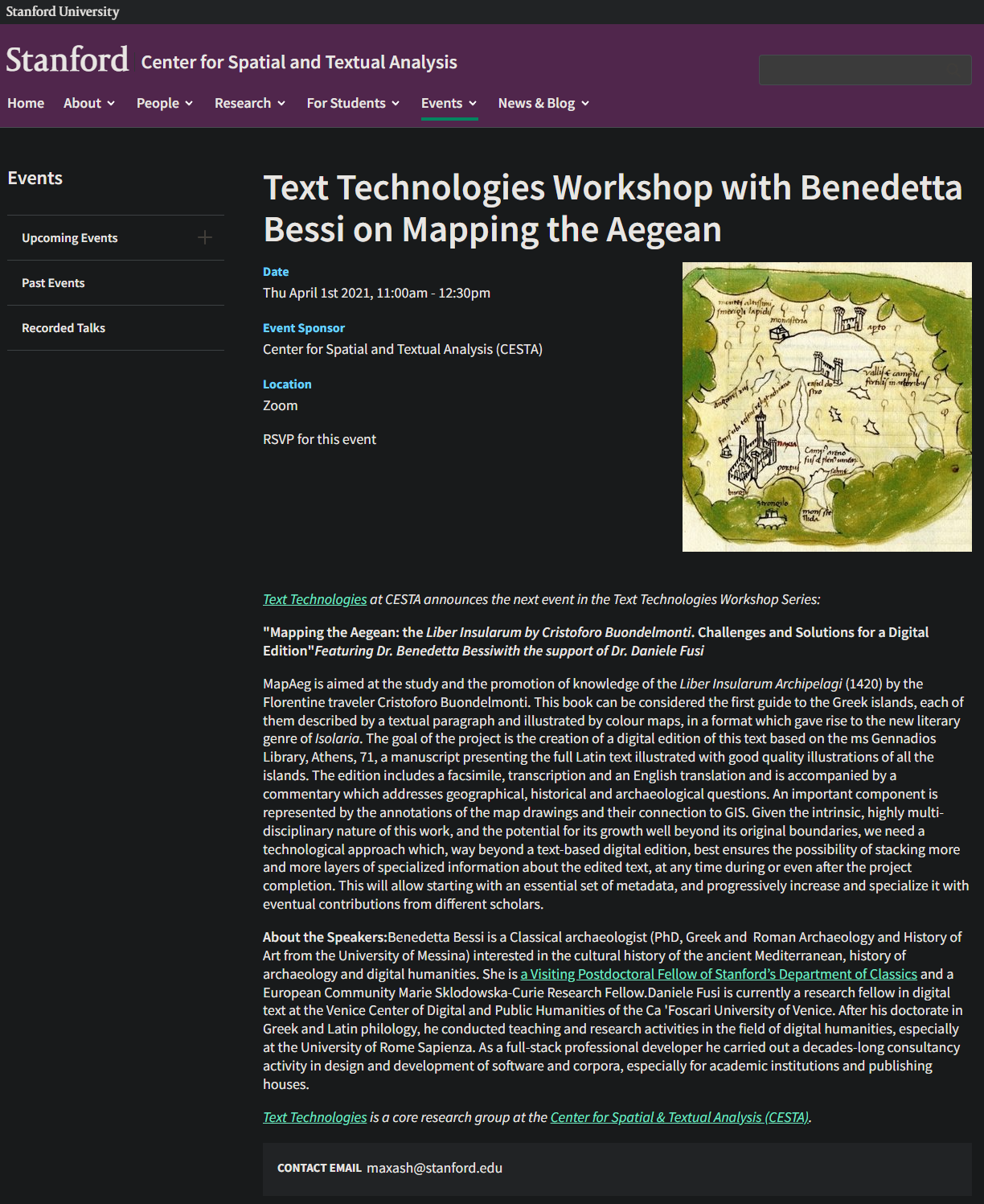 Finally, I want to highlight that, thanks to my double affiliation and the contact I created between the VeDPH at Ca’ Foscari and CESTA at Stanford during my outgoing phase, a collaboration has been established between the two Centers and the two teams have met both in California (October 2022), and in Italy (October 2023). A third meeting will be held at Stanford in the Spring 2024 (April 22-26). I consider this result particularly impactful because the collaboration between Ca’ Foscari and Stanford will allow a bilateral transfer of knowledge, skills, and best practice in Digital Humanities in a dimension which goes beyond the scope and length of MapAeg.