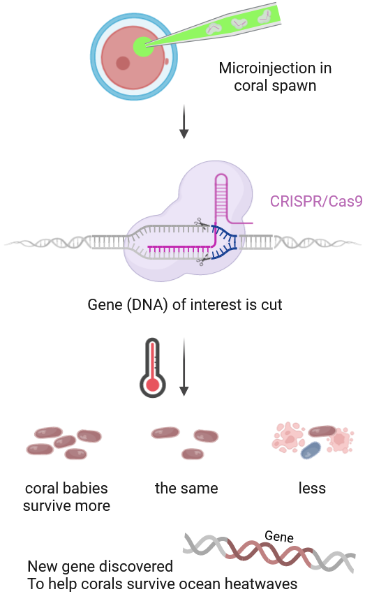 The work carried out enhances the innovation capacity of the fields of coral gene editing and coral reef conservation, by screening candidate genes and their role in thermal adaptation and by developing a high-throughput method of gene editing in corals. It addresses issues related to climate change and the environment by providing tools to understand the genetic mechanisms that take place in corals to cope with the heat stress in the oceans due to climate change. Coral reefs have immense societal value. The conservation of reefs and the ecosystem services they provide to humanity is of paramount importance.