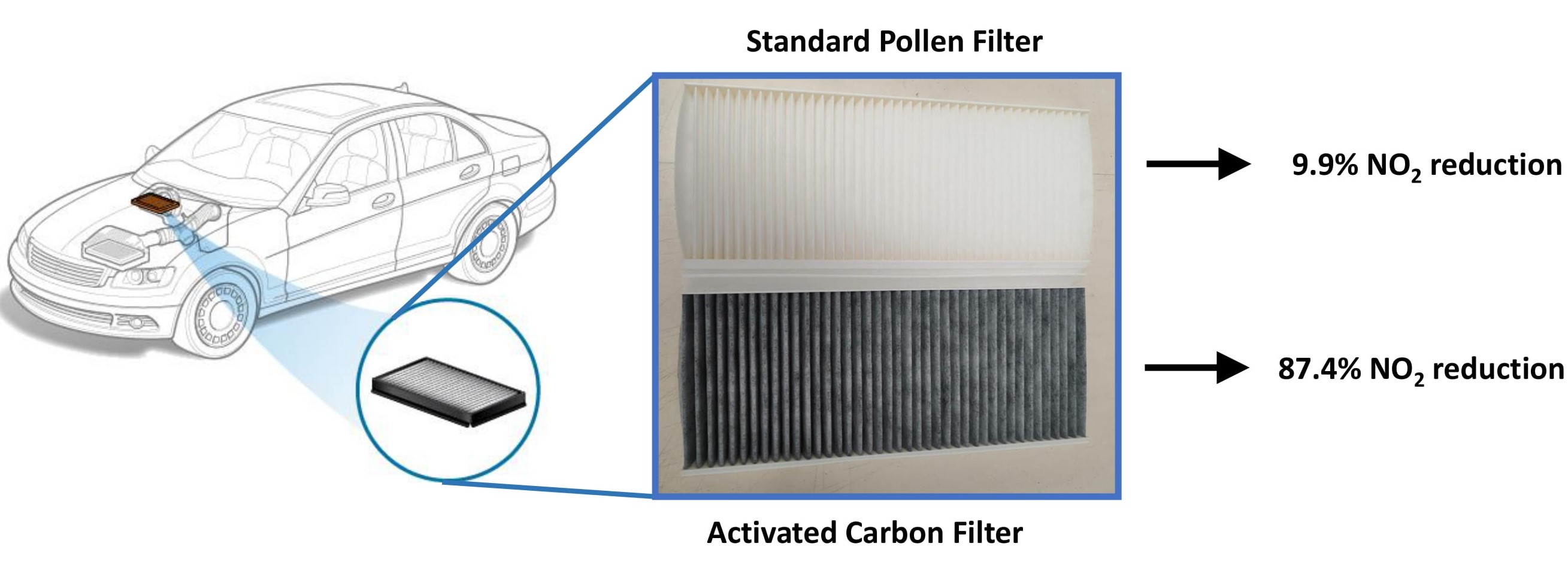 • The use of appropriate car cabin filter in conjunction with the optimal ventilation setting can result in 14- fold reduction in-vehicle NO2 and PM2.5 concentrations.