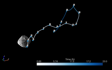 We also performed preliminary analyses of the Hayabusa2 extended mission that still has a projectile among its payloads. We analysed the effects of the projectile impact on the asteroid surface, under the challenging dynamical environment (Figure 9), and the spacecraft's safety during the proximity operations for the projectile release. These analyses have been presented in several meetings held with the astrodynamics and science team of the Hayabusa2 SHARP mission.