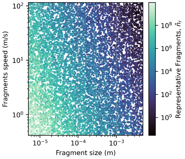 Finally, we developed a tool for characterising the ejecta plume generated by an impactor. The importance of such an analysis is twofold: a deeper understanding of the impact phenomena for better model developments and knowledge of asteroid composition and formation, and the plume characterisation to identify regions of higher concentrations of particles. We also propose a visualisation tool to generate synthetic images of impact cratering events by exploiting the fragment's sampling, propagation and density estimate procedures (Figure 12).