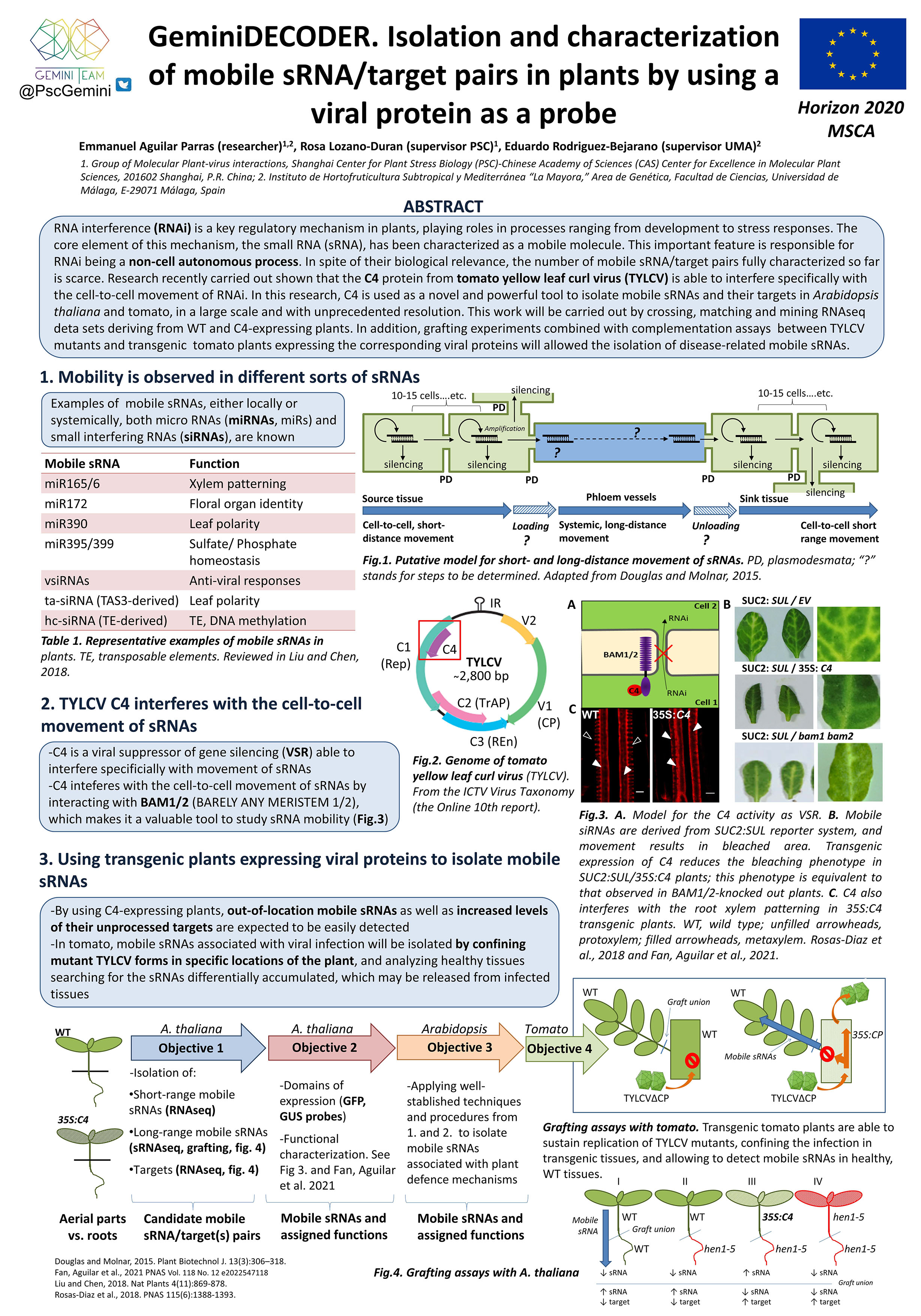 -Conclusions of the action: One viral protein, the C4 protein from tomato yellow leaf curl virus (TYLCV), has been characterized as the most suitable probe for the isolation of mobile sRNAs, in a massive way and with improved resolution. By doing so, new mobile sRNA species are now available for biological characterization, and genetic elements responsible for regulating their movement have been exposed. These findings open the possibility of increasing crop resilience and production just through the exploitation of the plant endogenous regulatory mechanisms.