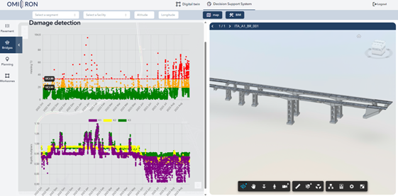 4. Road digital twin and decision support system: The information provided by the OMICRON technologies and legacy systems is to be integrated in the digital twin creating a customised virtual representation of the real-world assets providing access to real-time data. The decision support tool will integrate with the digital twin, achieving predictive maintenance through infrastructure condition analysis and asset management plan optimisation.