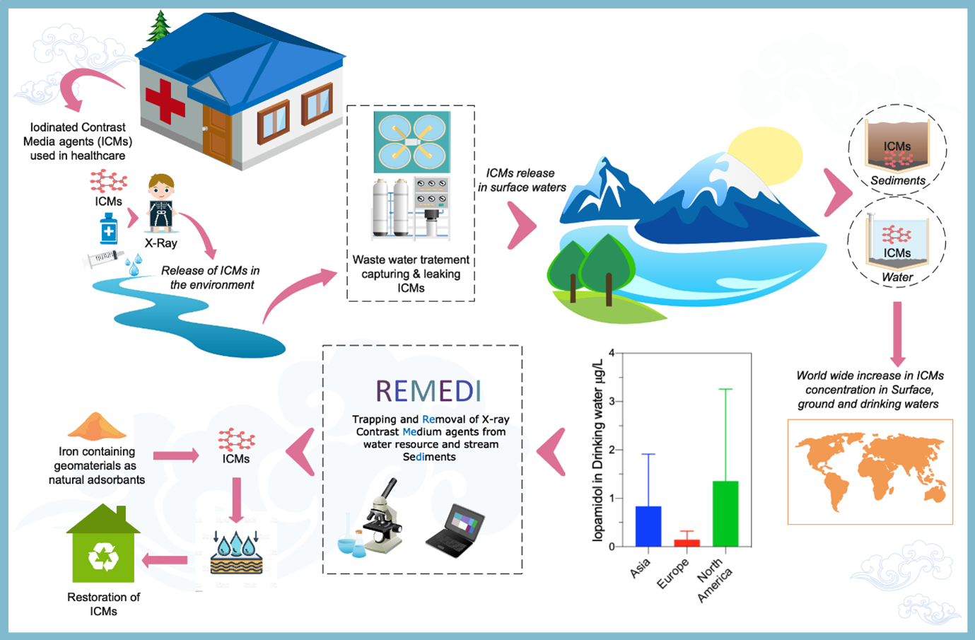 REMEDI works towards the implementation of a circular economy paradigm for CMA production. This is a relevant objective contributing to securing supply critical pharmaceutical products. At the same time the project has a foreseen on environmental sustainability regarding medical use of CMA. The project has then wide foreseen impacts across the scientific and industrial sector. The project target can only be accomplished while relying on a sound technical understanding of the chemical and physical processes influencing CMA fate. Behaviour of CMA in natural water and porous media has been only partially explored to date. REMEDI is taking a systematic approach to this problem with a major research effort. Preliminary results show promising results in terms of (i) design appropriate materials for CMA recovery, (ii) interpretation of laboratory data, (iii) use of machine learning approaches to build flexible tools to characterize the fate of CMAs in natural waters. To these end, REMEDI is pursuing a multi-scale and multi-disciplinary effort combining molecular dynamics simulations with laboratory experiments and microfluidics devices.