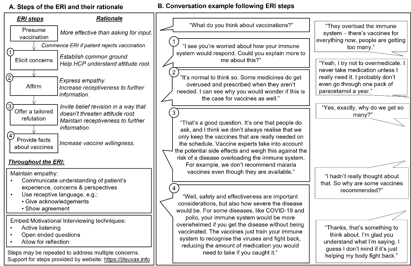 HCPs are in an excellent position to speak with patients about their vaccination decisions. Training HCPs to refute misleading anti-vaccination arguments that patients may raise can help increase their confidence in having such conversations. We designed the Empathetic Refutational Interview (ERI) (see figure) which involves first affirming the patient’s underlying attitude root, in order to communicate empathy for the patient, and then refuting common misconceptions. This technique was successfully tested in a series of psychological experiments among vaccine-hesitant individuals, providing support for the ERI in controlled settings.